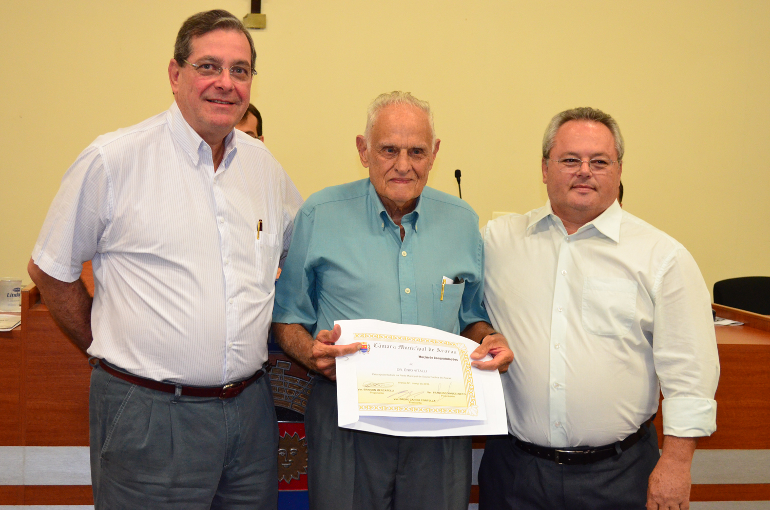 Os vereadores Erinson Mercatelli (PSB) e Franscisco Nucci Neto (PMDB) entregaram moção de congratulação na 6ª Sessão Ordinária para o Dr. Ênio Vitalli pelo encerramento de carreira na rede municipal de saúde pública. O médico completou 61 anos de atuação profissional, sendo 58 anos de atendimento no município de Araras. Nascido em 3 de novembro de 1928 na cidade de São Sebastião da Grama, em São Paulo. Filho de Judith Giacon Vitalli e Caetano Vitalli, se formou como médico em 1953 pela...