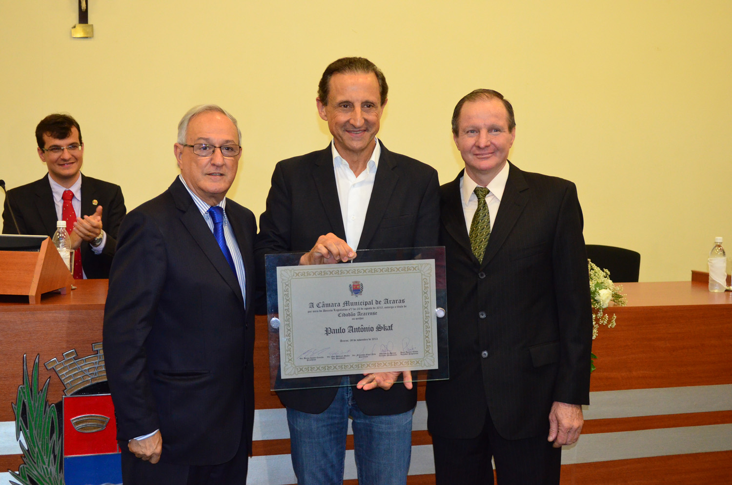 Na tarde de sexta-feira (8) a Câmara Municipal de Araras realizou sessão solene de outorga do Título de Cidadão Ararense ao presidente da Fiesp (Federação das Indústrias do Estado de São Paulo), Paulo Skaf. A mesa da solenidade foi composta pelo presidente do Legislativo, vereador Breno Cortella, pelo prefeito de Araras Dr. Nelson Dimas Brambilla, pelo vereador e secretário Francisco Nucci Neto e pelos vereadores da 15ª Legislatura, proponentes do título, Eduardo de Moraes e Derci Tófolo....