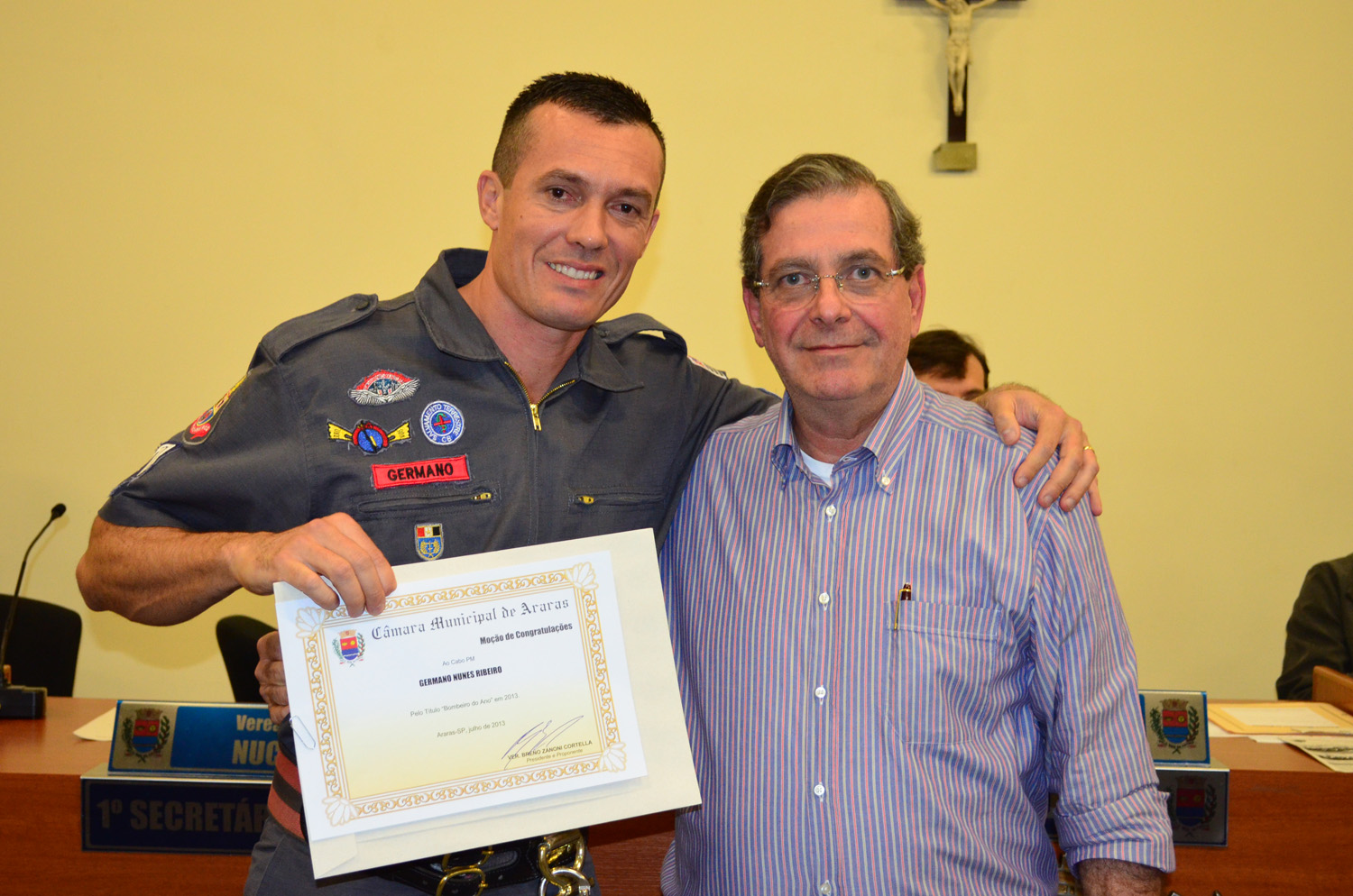 A Câmara Municipal de Araras realiza nesta segunda-feira (1º) durante a 22ª Sessão Ordinária, a partir das 20h, o ato solene de outorga do título de “Bombeiro do Ano” para o Cabo PM Germano Nunes Ribeiro. O título de “Bombeiro do Ano” é uma tradicional honraria do Poder Legislativo Municipal, entregue todos os anos, em data próxima ao Dia do Bombeiro, comemorado anualmente no dia 2 de julho. A homenagem é realizada conforme decreto legislativo nº 15, de 22 de dezembro de 2003, de autor...