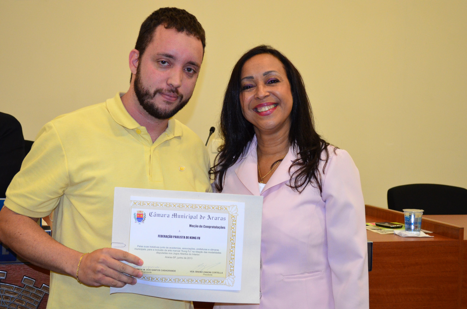 Na 18ª Sessão Ordinária da Câmara Municipal de Araras, realizada na segunda-feira (3) a vereadora Anete Monteiro dos Santos Casagrande (PSDB) entregou moção de congratulações para a Federação Paulista de Kung Fu, pelas suas tratativas junto às academias, associações, Prefeituras e Câmara Municipais, para inclusão da arte marcial na relação das modalidades disputadas nos Jogos Abertos do Interior. O diretor cultural e eventos da federação, Elcio Rodrigues Júnior, representando o pres...