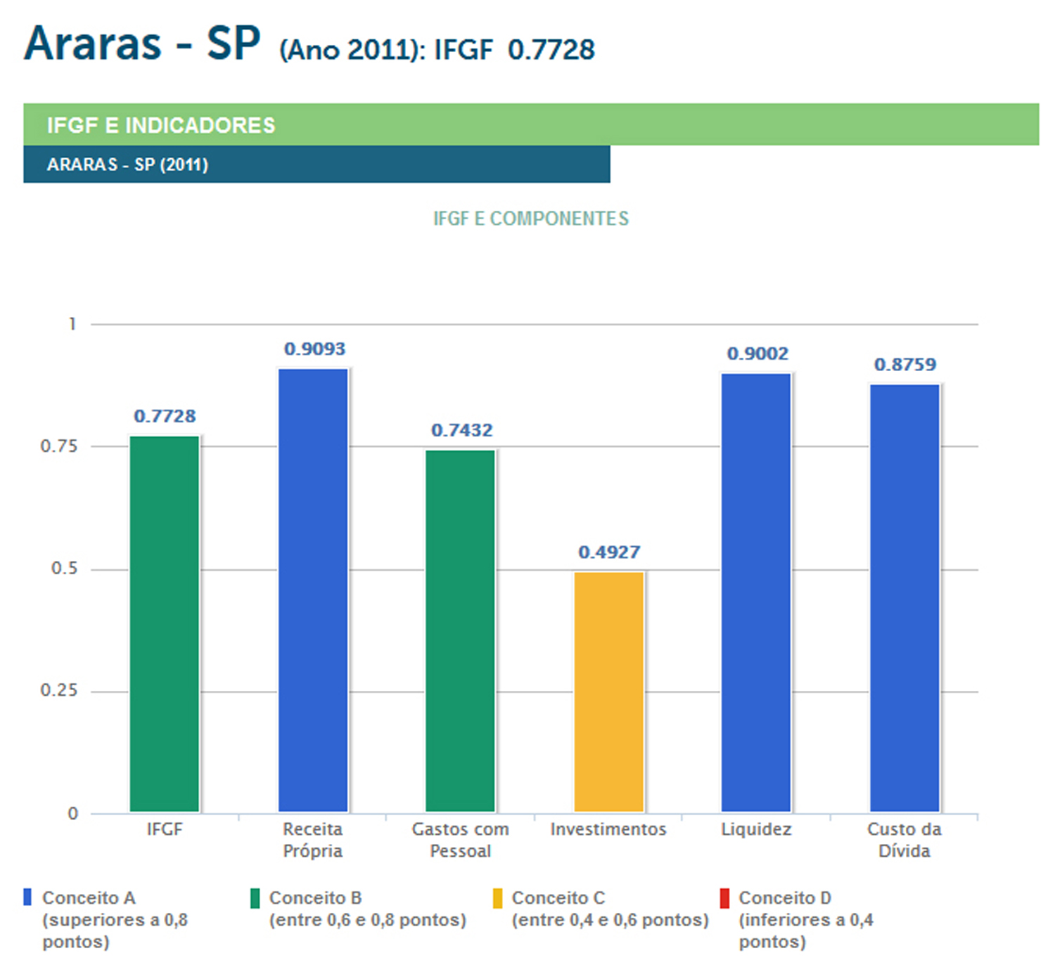 O índice varia entre 0 e 1, quanto maior a pontuação, melhor é a gestão fiscal do município. Cada município é classificado com conceitos A (Gestão de Excelência, acima de 0,8001 ponto), B (Boa Gestão, entre 0,6001 e 0,8), C (Gestão em Dificuldade, entre 0,4001 e 0,6) ou D (Gestão Crítica, inferiores a 0,4 ponto).