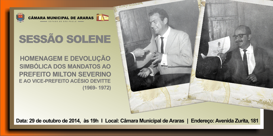 A Câmara de Araras realizada na próxima quarta-feira (29) sessão solene para homenagem e devolução simbólica dos mandatos do prefeito e vice-prefeito Milton Severino e Acésio Devitte. A cerimônia acontecerá às 19h, no Plenário "Ver. Bruno Moysés Batistella" e irá contar com a presença dos familiares, amigos e companheiros de militância política dos homenageados falecidos.